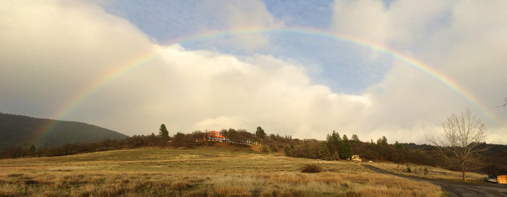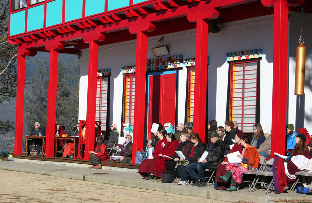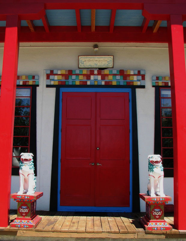 Tashi Chöling’s traditional Tibetan temple faces south on an open hillside, as monasteries are often oriented on the mountains and cliffs of Tibet. The 4-story temple, with its colorful roofs, ornaments, red pillars and fluttering prayer flags, sparkles like a jewel amidst the rugged Siskiyou Mountains.