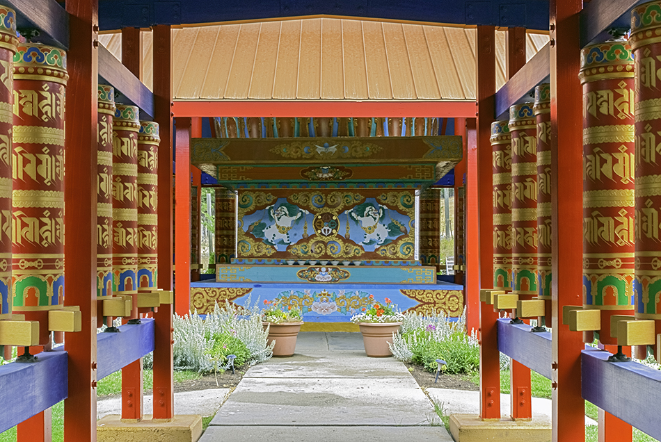 The Mandala Garden is located in the meadow below the temple. Entering its front gate, one walks down a pathway lined with beautifully painted prayer wheels. The garden is home to a 35-foot high statue of Vajrasattva and 20-foot high statues of White Tara and Green Tara placed on either side. Prayer wheels surround three sides of the Vajrasattva statue, allowing visitors to turn them as they circumambulate the statue.