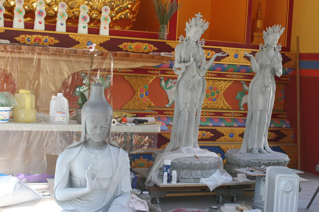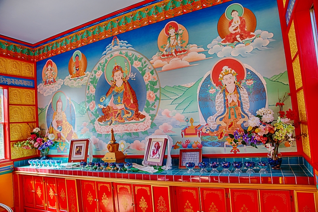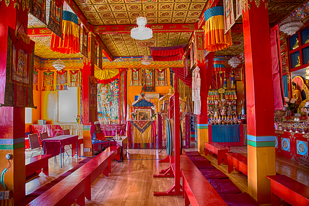 The temple’s interior presents a vivid display of traditional Tibetan sacred art and architecture. A complete scriptural library and eight larger-than-life-sized statues fill the long altar. Thangka paintings depicting the life of the Buddha and other enlightened masters hang on saffron colored walls. This rich contemplative art, along with the butter lamps, incense, flowers, water bowls, and other offerings, combine to create an atmosphere of joyful tranquility within the temple.