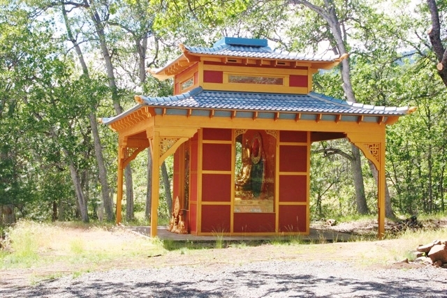 Gyatrul Rinpoche wished to place a Parinirvana Stupa near the Amitabha Pavilion. The stupa was completed in 2006 by the Nepalese artist Sonam Tsering, with help from sangha members. As Rinpoche noted, “In general, the presence of stupas and statues act to pacify war, famine, disease, natural disasters and the devastating effects of global warming, which is a big concern to many people nowadays.”