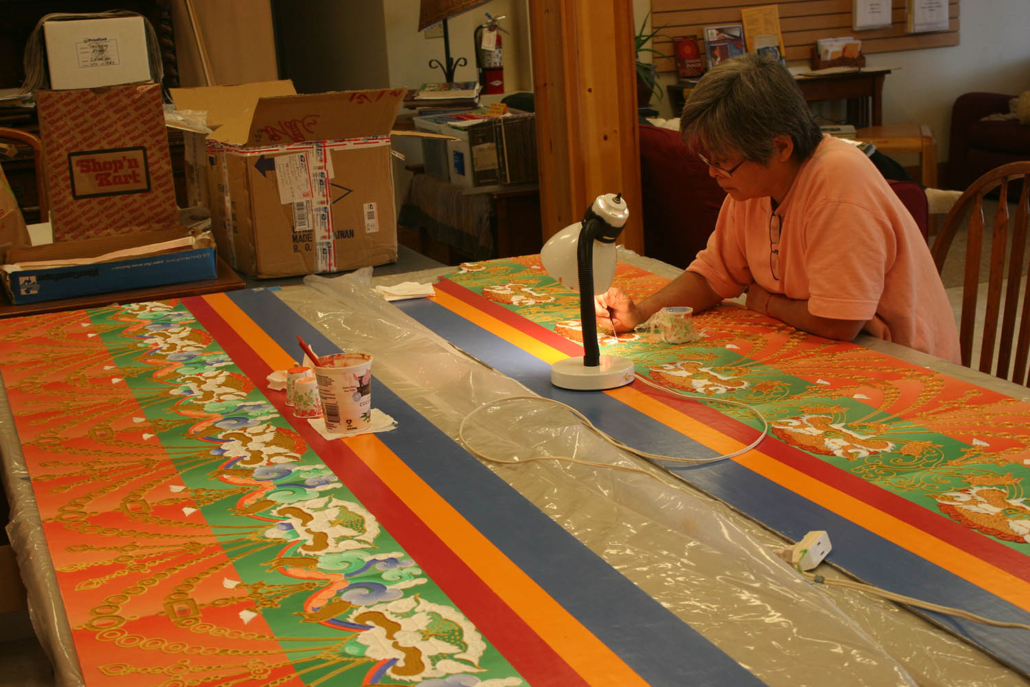 The East Wing, a two-story structure adjacent to the temple, provides a warm environment where sangha can gather to share meals, study, converse, and accomplish dharma projects. Its ground floor houses a kitchen, dining hall, restrooms, laundry facilities and areas for making tormas and preparing tsog. In addition, there is a bookstore with a wonderful array of books, CDs, photos, malas, brocade wall hangings and other dharma items. The second floor holds Vimala Publishing’s office, quarters for visiting lamas, and accommodations for visitors.